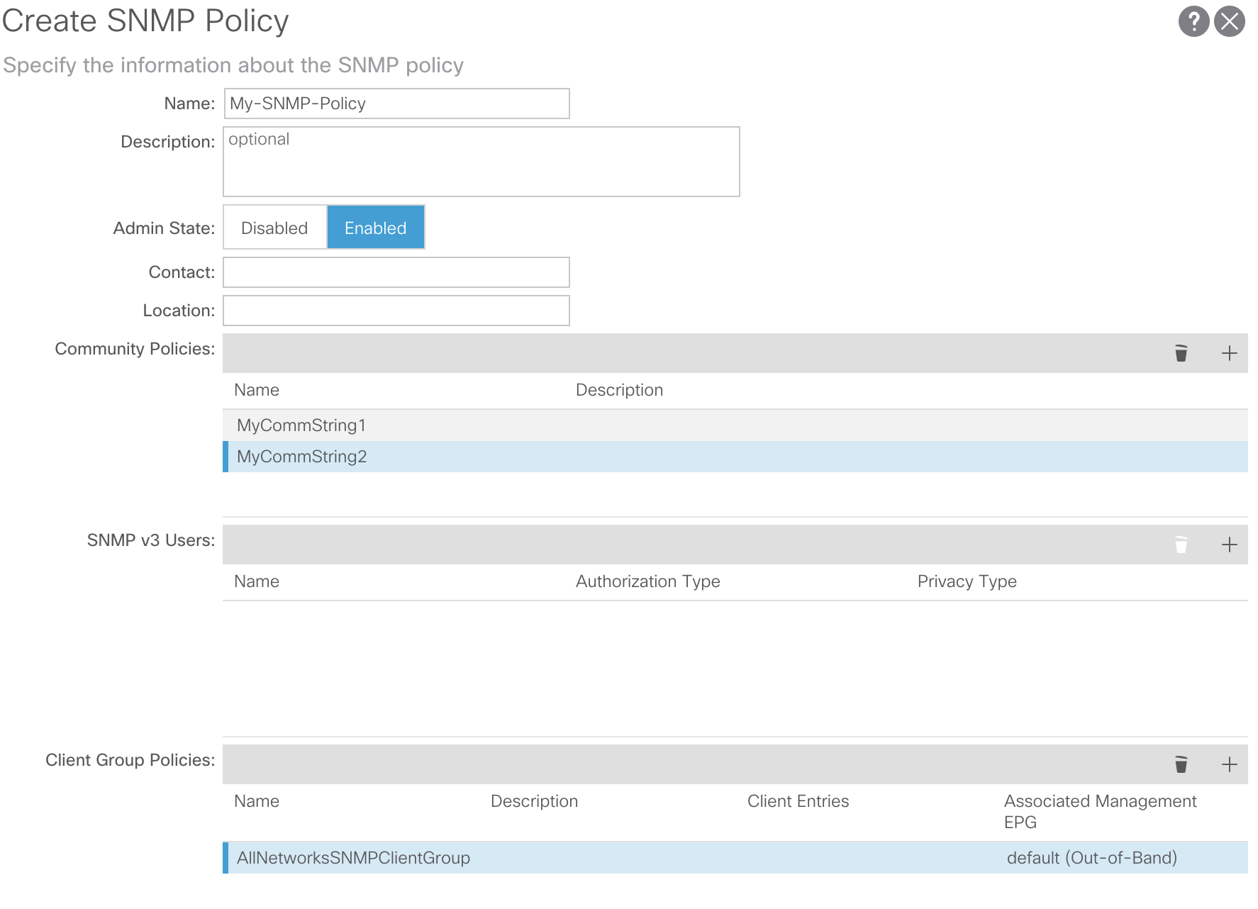 Let’s call our SNMP Policy My-SNMP-Policy. For our purposes we are going to use SNMP version 2c so the only fields we are going to focus on are Community Policies and Client Group Policies.
