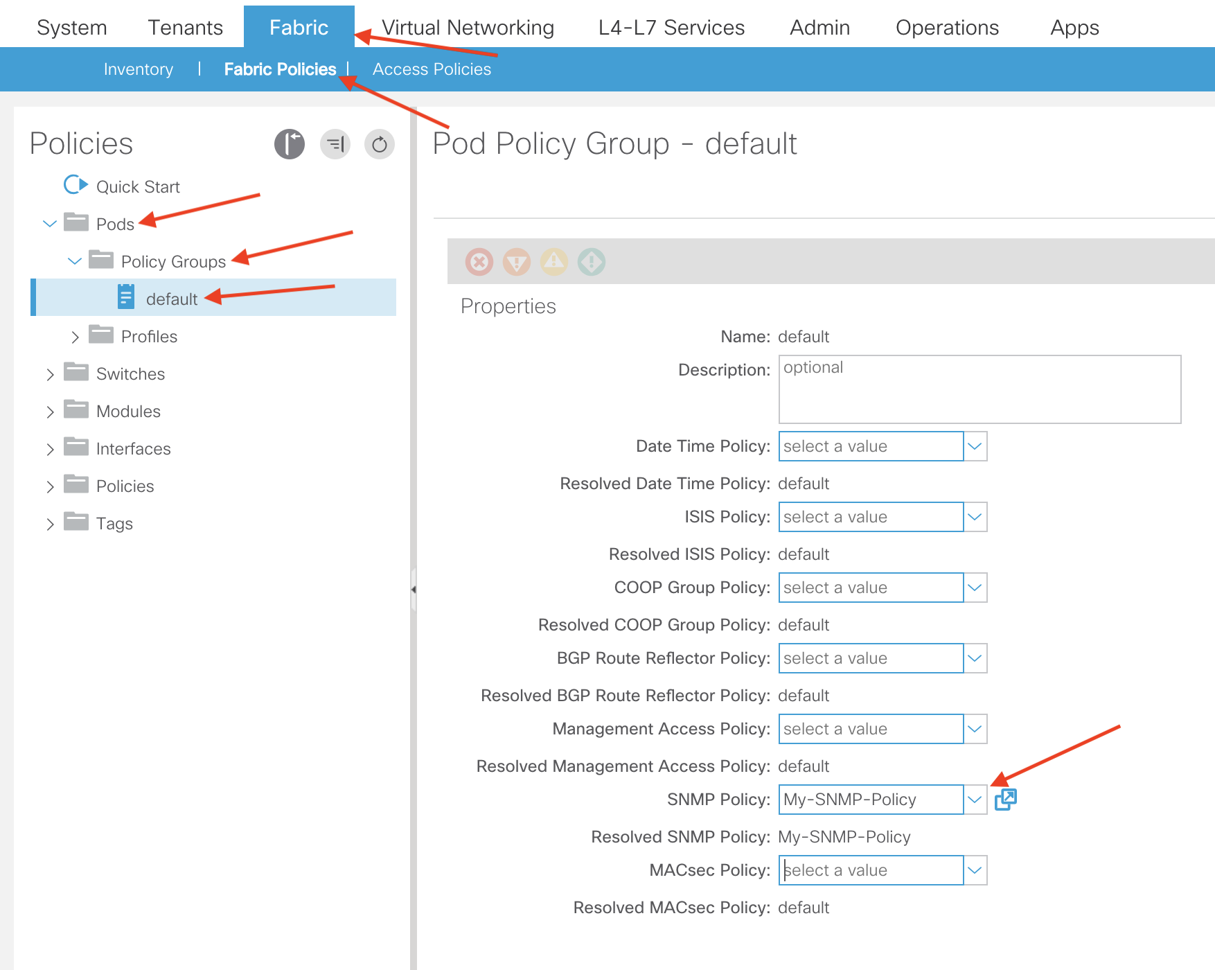 Fabric -> Fabric Policies -> Policies -> Pod -> SNMP
