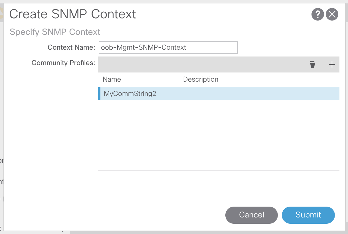 After selecting this you will be prompted to name the SNMP Context for your VRF. You can only create one SNMP Context per VRF and you will want to give meaning to your SNMP Context Name, you will see why shortly. For our purposes we will name our SNMP Context for our oob VRF oob-Mgmt-SNMP-Context and add a Community Profile. The Community Profile is simply one of the community strings we created previously during the Fabric Policy SNMP configuration. For our SNMP VRF context we will use the previously created MyCommString2 community string. Our configuration will look like such: