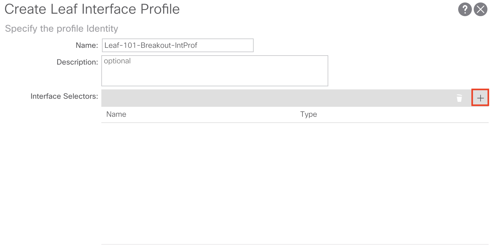 Next we need to add an additional Leaf Interface Selector to our Leaf Interface Profile for our child breakout interfaces. Select the + button to add another Leaf Interface Profile:
