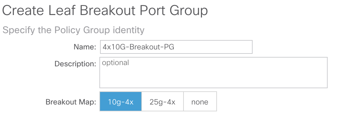 As mentioned earlier we’ll need to create two Leaf Interface Selectors, one for our breakout parent interface and the other for our breakout child interfaces. For our configuration of the breakout parent interface we’ll name our Leaf Interface Selector Breakout-Parent-IntSelect and use eth1/4 as our Interface ID. Additionally, we need to create/associate a Leaf Breakout Port Group as our Policy Group to signify that eth1/4 will be used as a breakout parent interface: